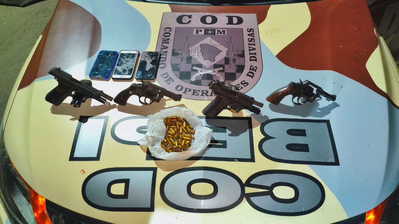 Durante o patrulhamento na região do Alto da Penha, no Crato, as equipes do BEPI se depararam com o veículo suspeito e tentaram realizar a abordagem. No entanto, os ocupantes efetuaram disparos contra os policiais, que reagiram à injusta agressão, em legítima defesa. Após o confronto, quatro suspeitos, com idades de 19, 23, 25 e 29 anos, foram socorridos e encaminhados ao hospital, porém não resistiram aos ferimentos e foram a óbito. Dentro do veículo foram apreendidas quatro armas de fogo, sendo duas pistolas e dois revólveres, além de munições e aparelhos celulares. O carro, que tem registro de roubo, também foi recuperado.