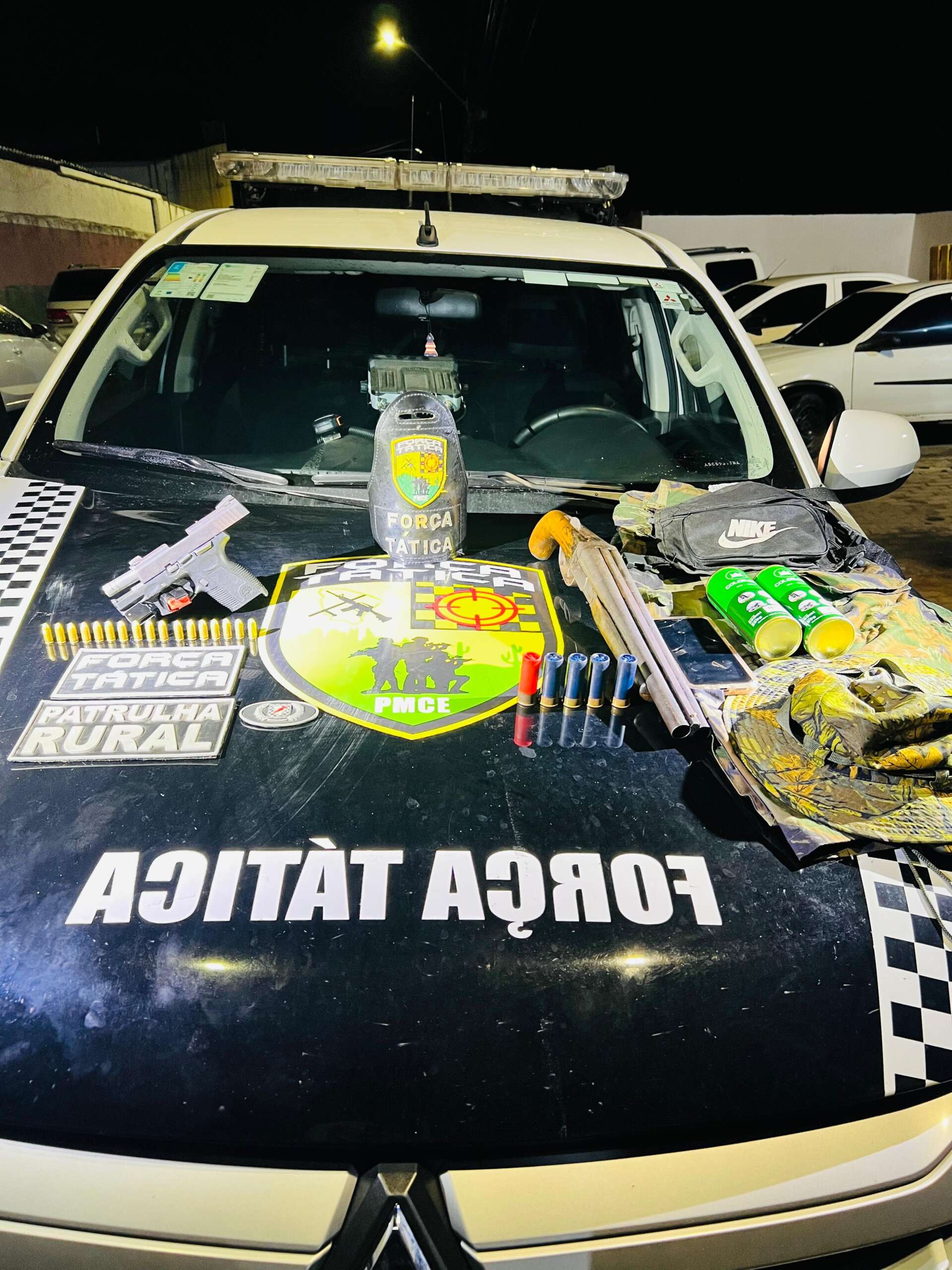 Já a segunda ocorrência resultou na apreensão de um revólver e entorpecentes no bairro Cumbuco, durante patrulhamento ostensivo intensificado na região do litoral, em razão de conflitos entre grupos criminosos. Na Avenida das Dunas, a equipe policial visualizou cerca de cinco indivíduos encapuzados que, ao perceberem a aproximação da viatura, fugiram em direção às dunas. Os policiais militares realizaram acompanhamento e varredura na área, porém os suspeitos conseguiram se evadir.