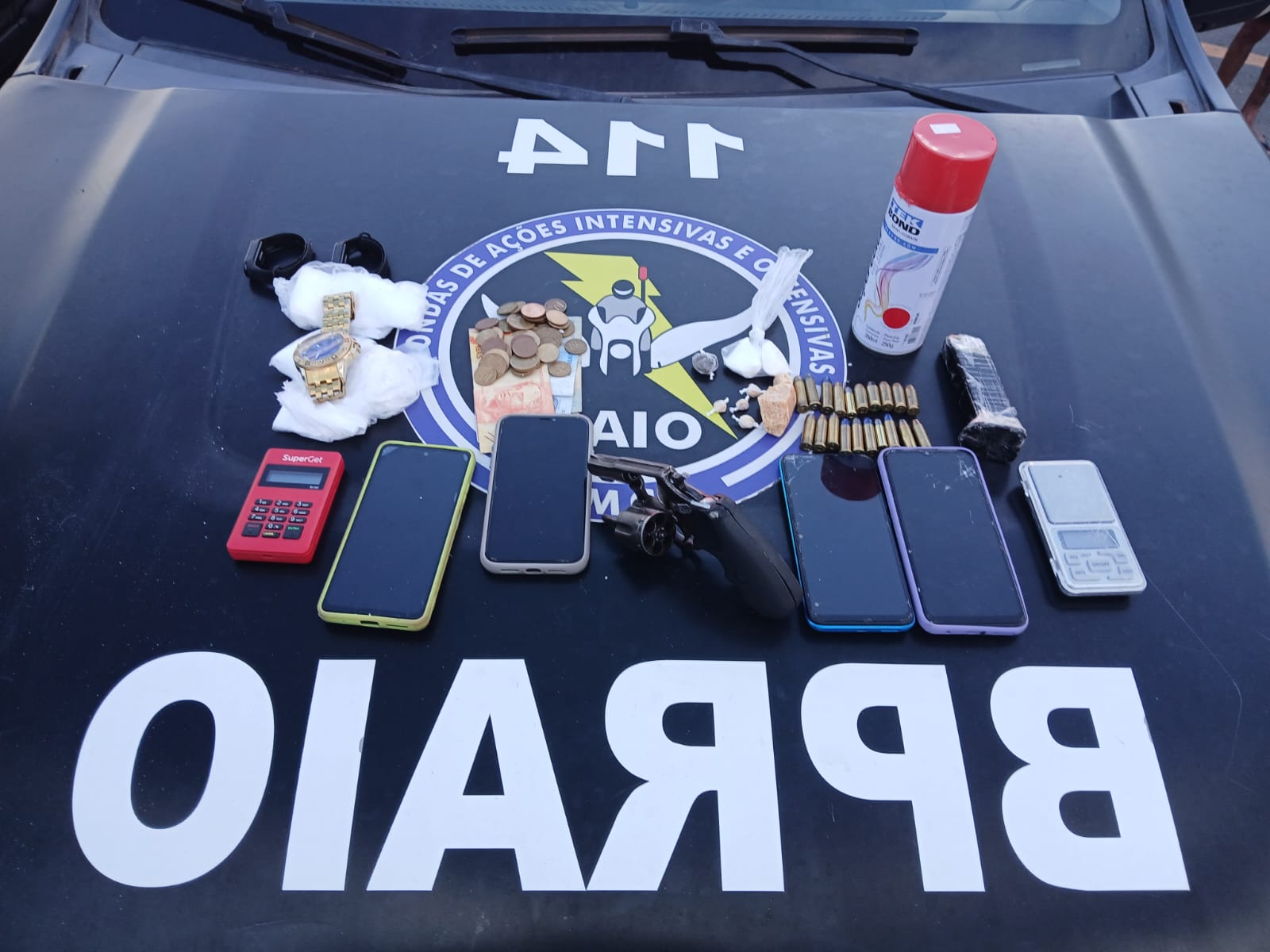 Diante da situação, a equipe realizou a abordagem em um dos suspeitos ainda na calçada, enquanto os demais tentaram fugir para o último andar do prédio. Durante a ação, os policiais observaram que os indivíduos arremessaram um objeto pela janela. Após buscas no terreno ao lado do edifício, foi localizado um revólver calibre .32, além de munições de diversos calibres (.32, .38 e .40), um carregador de pistola calibre .40 e entorpecentes.