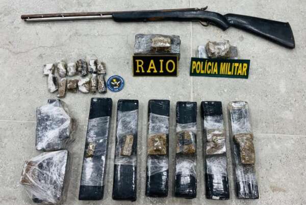Primeiramente, os policiais receberam denúncias anônimas e se deslocaram até a Rua do Escondido. No local, realizaram diligências e perceberam movimentação suspeita. Durante varreduras nos quintais próximos, em um ponto do terreno que dá acesso a uma área de matagal, os policiais sentiram forte odor de maconha. Ao verificarem um saco no local, apreenderam 9,8 kg de maconha e uma espingarda artesanal.