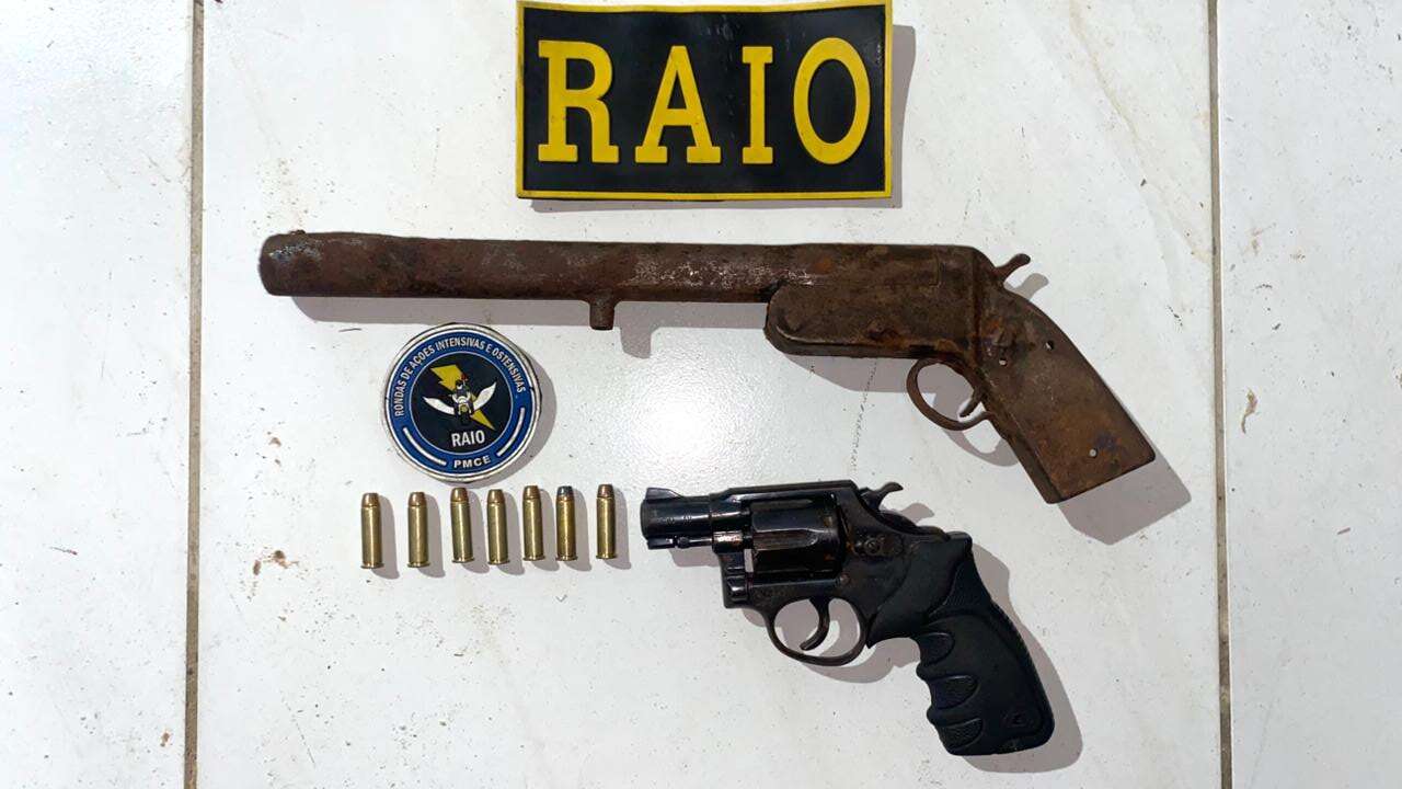 A Polícia Militar do Ceará (PMCE) apreendeu duas armas de fogo durante uma ocorrência realizada por equipes do Comando de Policiamento de Rondas de Ações Intensivas e Ostensivas (CPRaio), na noite dessa terça-feira (27), no bairro Precabura, no município de Eusébio.