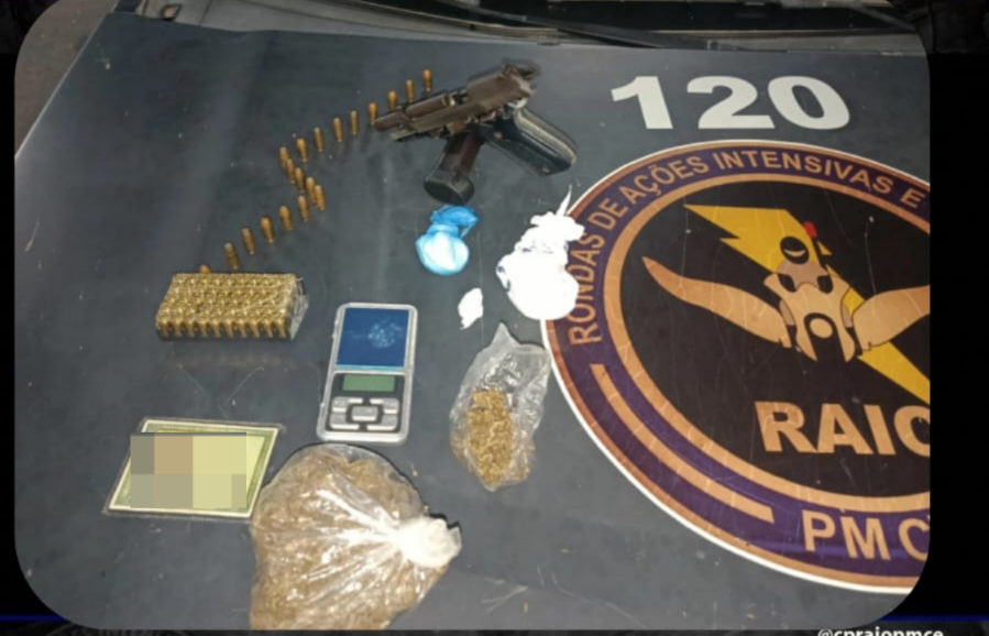 Agentes do Comando de Policiamento de Rondas de Ações Intensivas e Ostensivas (CPRaio) da Polícia Militar do Ceará (PMCE) prenderam um homem de 22 anos e apreenderam uma arma de fogo, munições e entorpecentes na noite dessa terça-feira (27), no bairro Aeroporto, em Juazeiro do Norte.