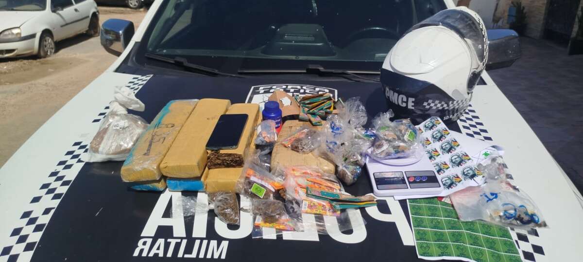 Durante a varredura no interior do imóvel, foram encontradas diversas substâncias entorpecentes e materiais característicos do tráfico de drogas. No local, foram apreendidos 6,3 quilos de maconha, 610 gramas de crack, 107 comprimidos de ecstasy/MDMA, além de uma balança de precisão, papéis de seda, sacos plásticos para embalagem, um aparelho celular danificado e outros materiais utilizados na preparação e comercialização dos entorpecentes.