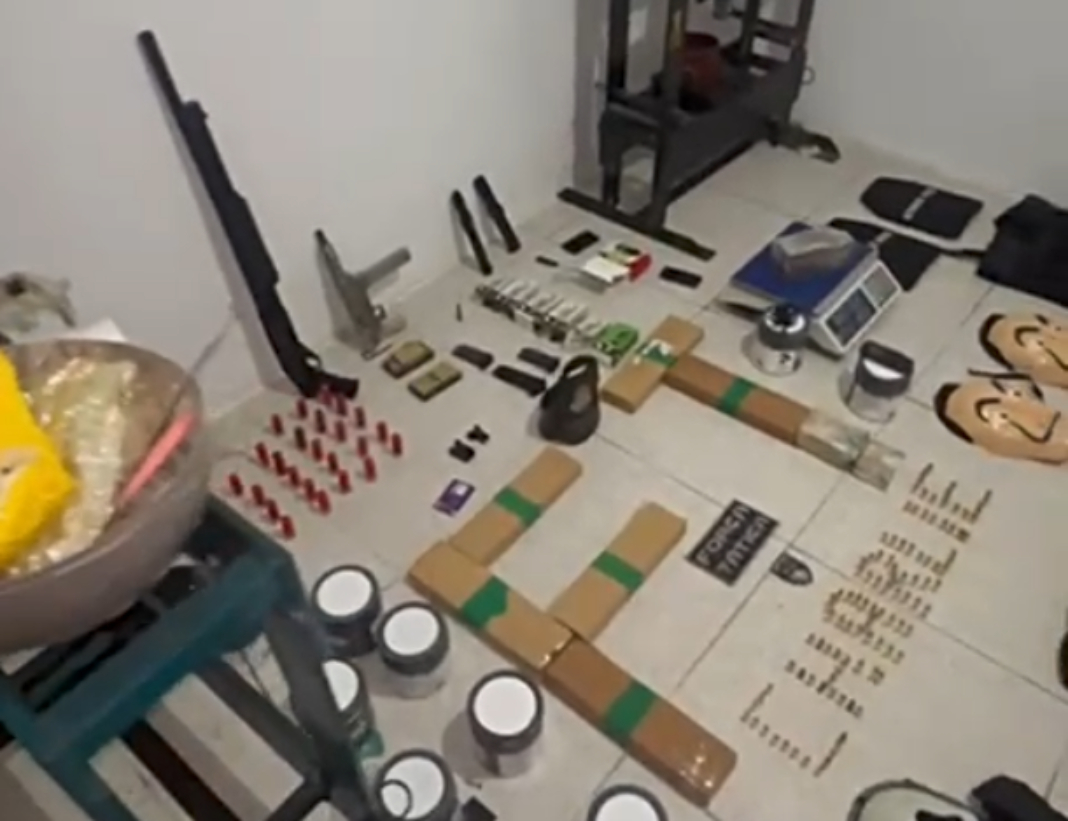 Além da submetralhadora de calibre 9 milímetros que estava com o suspeito, os policiais seguiram para o endereço identificado e apreenderam outros materiais ilícitos. No local, os militares recolheram uma espingarda, 81 munições de calibre 38, 30 munições de calibre 12, 91 munições de calibre 9mm, uma munição de fuzil, 38 munições de calibre .40 e cinco carregadores de diversos calibres, além de miras para submetralhadoras, uma balaclava, capas e placas de coletes balísticos, máscaras, um cinto tático e sacos plásticos.