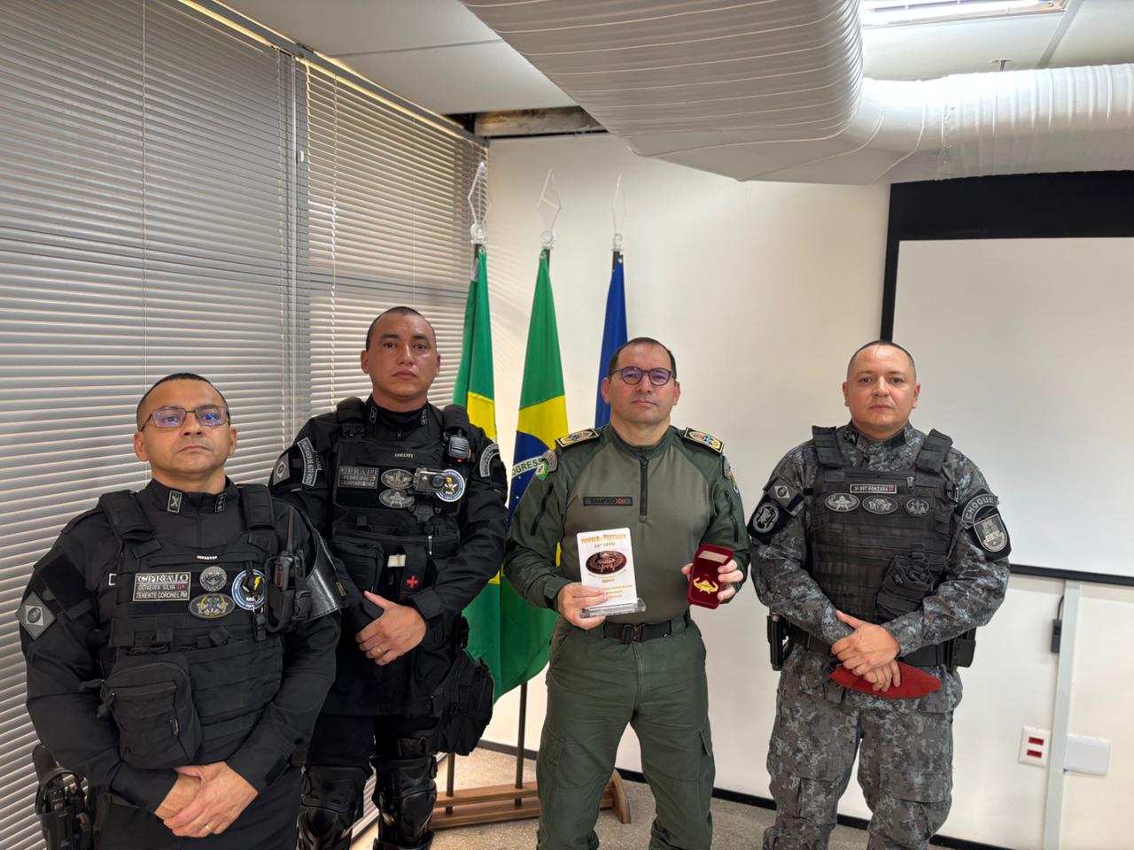 Também foram recebidos o capitão QOPM Márcio Ferreira Severino, do Comando de Policiamento de Rondas de Ações Intensivas e Ostensivas (CPRaio), e o 3º sargento Luis Gonzaga de Oliveira Junior, do Batalhão de Polícia de Choque, que concluíram o 14º Curso de Policiamento em Praças Desportivas (CPPD/2025), promovido pela Polícia Militar do Estado do Rio de Janeiro (PMERJ). O curso foi realizado no período de 8 de dezembro de 2025 a 23 de janeiro de 2026, com carga horária de 232 horas/aula, abrangendo conteúdos técnicos, táticos, jurídicos e operacionais voltados à atuação policial em eventos esportivos de grande porte.