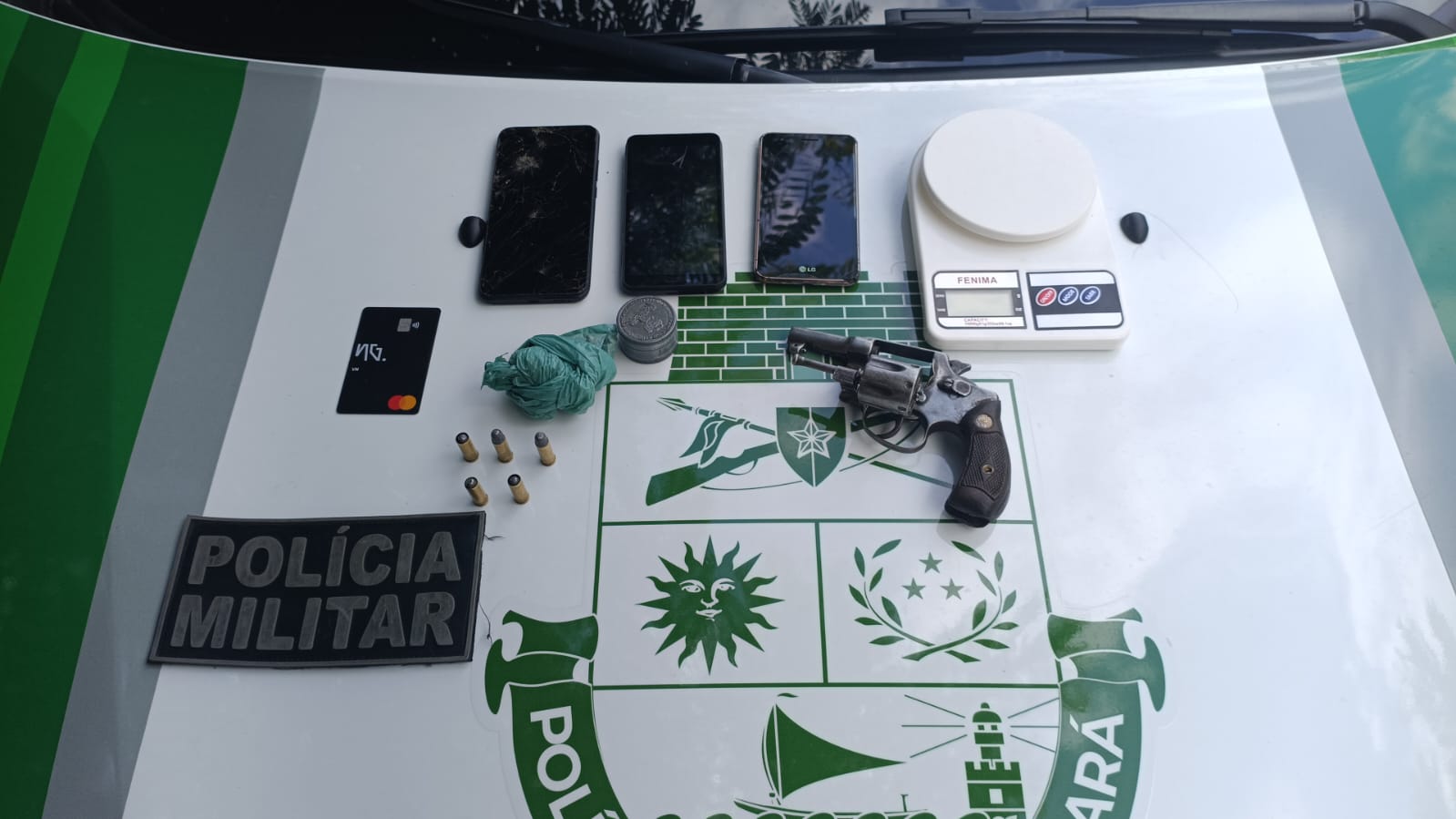 No local, foram apreendidos dois adolescentes, de 16 e 17 anos. Ainda durante a ocorrência, os policiais localizaram uma motocicleta Honda CG 125 Fan ES com queixa de roubo, um revólver calibre .32, cinco munições, três aparelhos celulares, uma balança de precisão e aproximadamente 2,8 gramas de maconha.