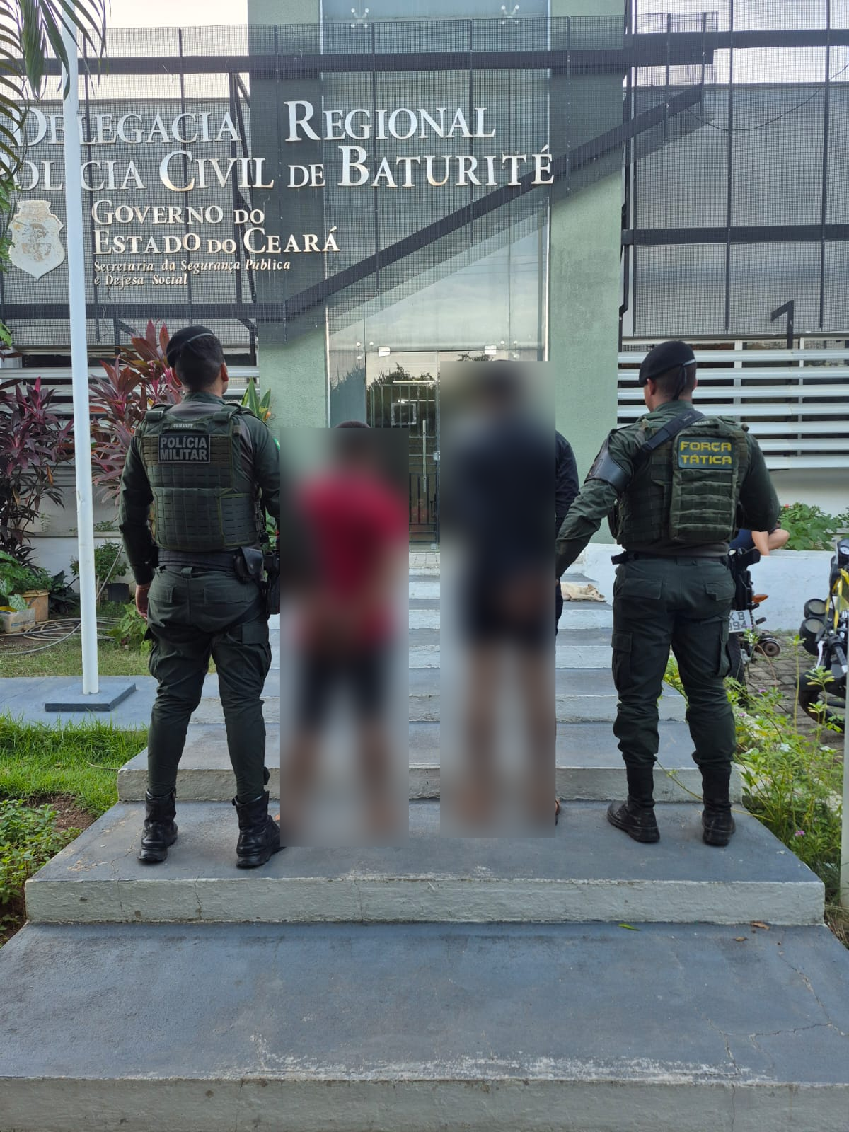 Os suspeitos e todo o material apreendido foram apresentados na Delegacia Regional de Baturité, onde foi lavrado auto de prisão em flagrante por porte ilegal de arma de fogo e consumo de drogas e dado cumprimento ao mandado de prisão.