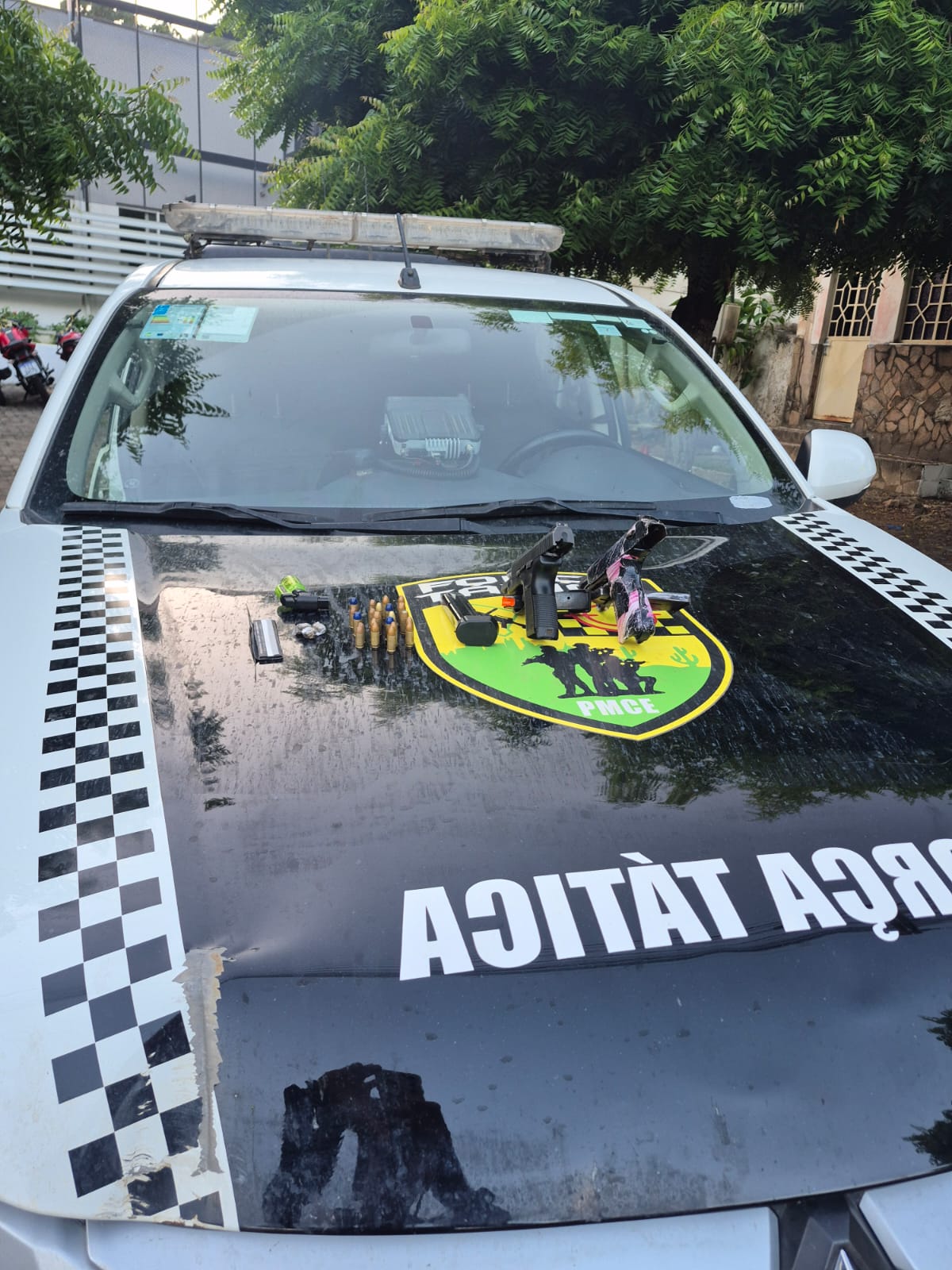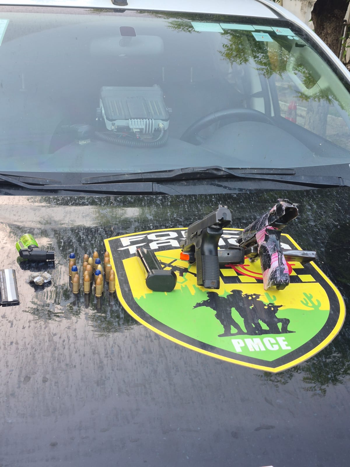 Durante as buscas, dois indivíduos foram visualizados caminhando na área. Um deles apresentava volume na cintura, o que motivou a abordagem. Com o homem de 23 anos, foi localizada uma pistola calibre .40, com numeração suprimida e sete munições intactas. O segundo abordado, de 26 anos, tentou se desfazer da arma ao perceber a aproximação policial, mas informou o local onde havia dispensado o armamento, sendo encontrada uma pistola calibre 9mm, municiada com dez munições intactas. Com este último, também foi apreendido um carregador de pistola calibre .380 com cinco munições, três trouxinhas de maconha (2,20 gramas), além de papel para consumo de entorpecente, um isqueiro, um aparelho celular e um carregador portátil.