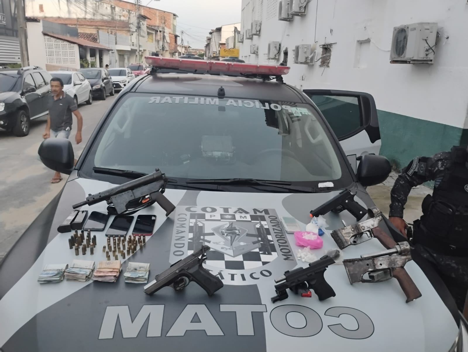 Na ação, foram apreendidas duas pistolas, sendo uma calibre .380 e outra de calibre indefinido, além de uma submetralhadora artesanal, munições de diversos calibres, cinco carregadores de pistola — um deles alongado —, aproximadamente 96 gramas de cocaína, 1,5 grama de maconha e 35,10 gramas de haxixe. Também foram recolhidos R$ 504 em espécie, um simulacro de pistola, um soco inglês artesanal, peças para confecção de arma artesanal, uma balança de precisão, quatro aparelhos celulares e cartões bancários.