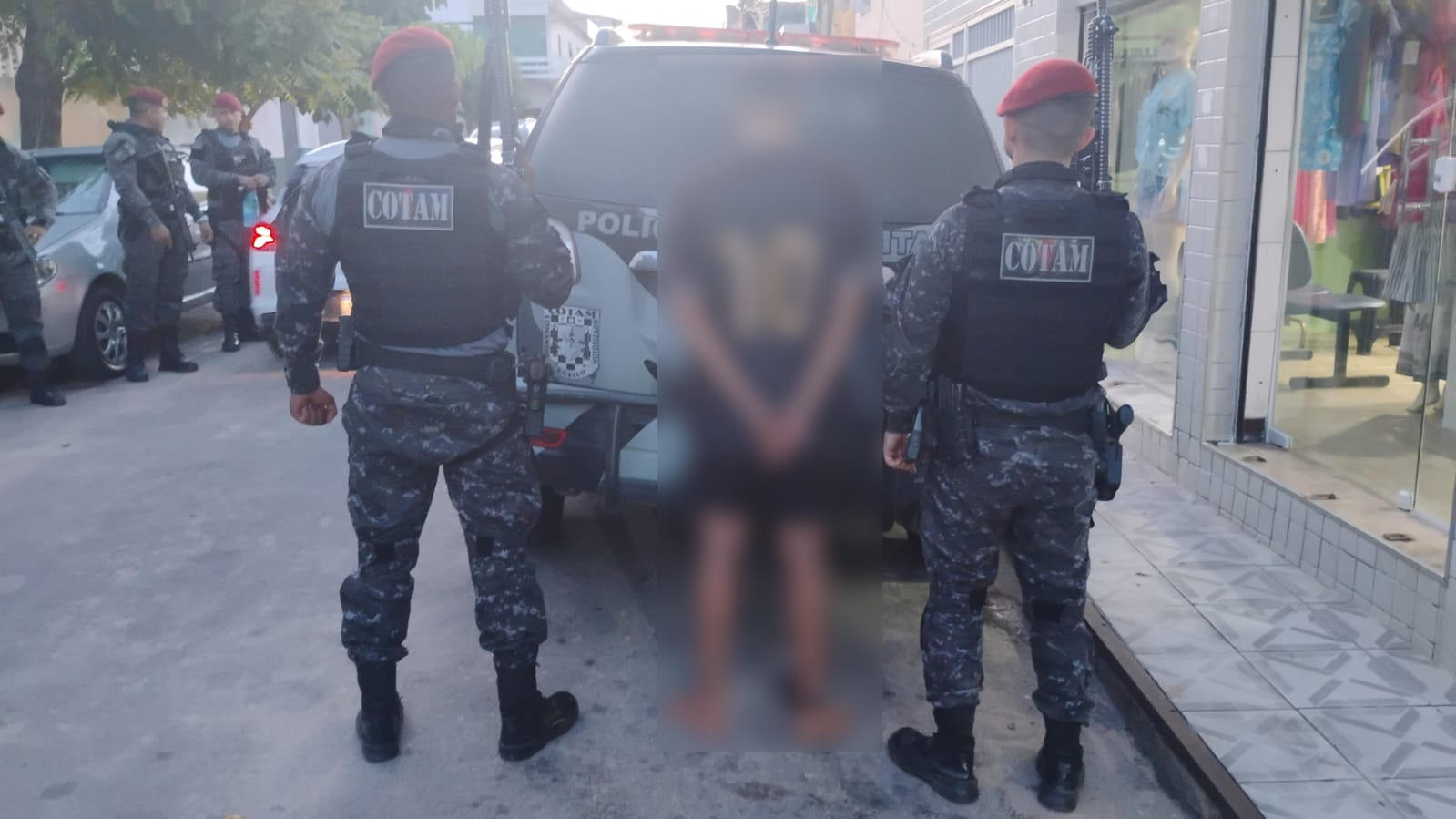 Diante das informações, as equipes do COTAM foram até a Rua Catarina Laboure sendo realizado o cerco policial ao imóvel indicado. Durante a aproximação das equipes, um dos suspeitos tentou fugir pelo quintal da residência, vindo a cair do segundo andar, sofrendo escoriações. Ele foi abordado em posse de uma mochila que continha armamentos. Durante o cerco, os policiais também localizaram, em um quintal vizinho, uma bolsa com drogas, dinheiro, balança de precisão e aparelhos celulares.