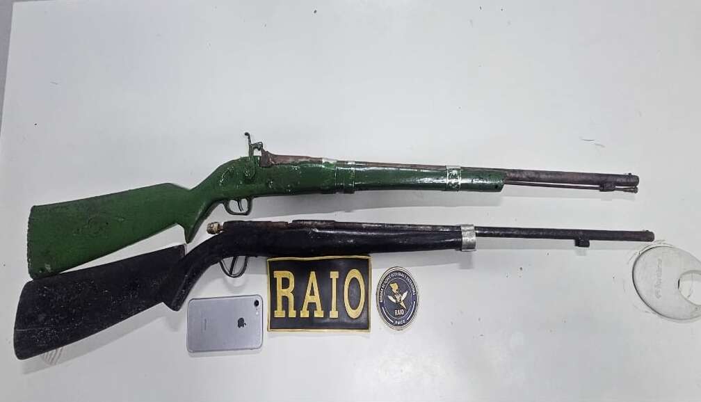 Ao chegar ao endereço indicado, os policiais realizaram diligências no imóvel. Durante as buscas, foram encontradas duas espingardas artesanais calibre 28, além de um aparelho celular, mas nenhum suspeito foi encontrado no local.