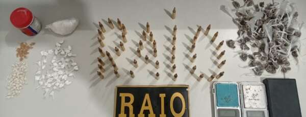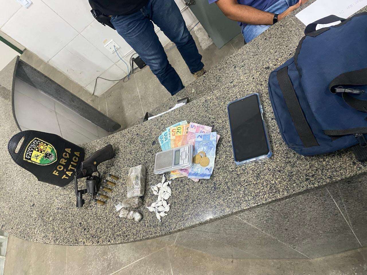 Com ele, foi apreendida uma bolsa do tipo pochete contendo um revólver calibre .38 com cinco munições, além de 101 gramas de maconha, 7 gramas de cocaína, uma balança de precisão e a quantia de R$ 429 em espécie. O suspeito e todo o material ilícito foram encaminhados à Delegacia de Polícia Civil de Horizonte, onde ele foi autuado por tráfico de drogas e porte ilegal de arma de fogo, permanecendo à disposição da Justiça.