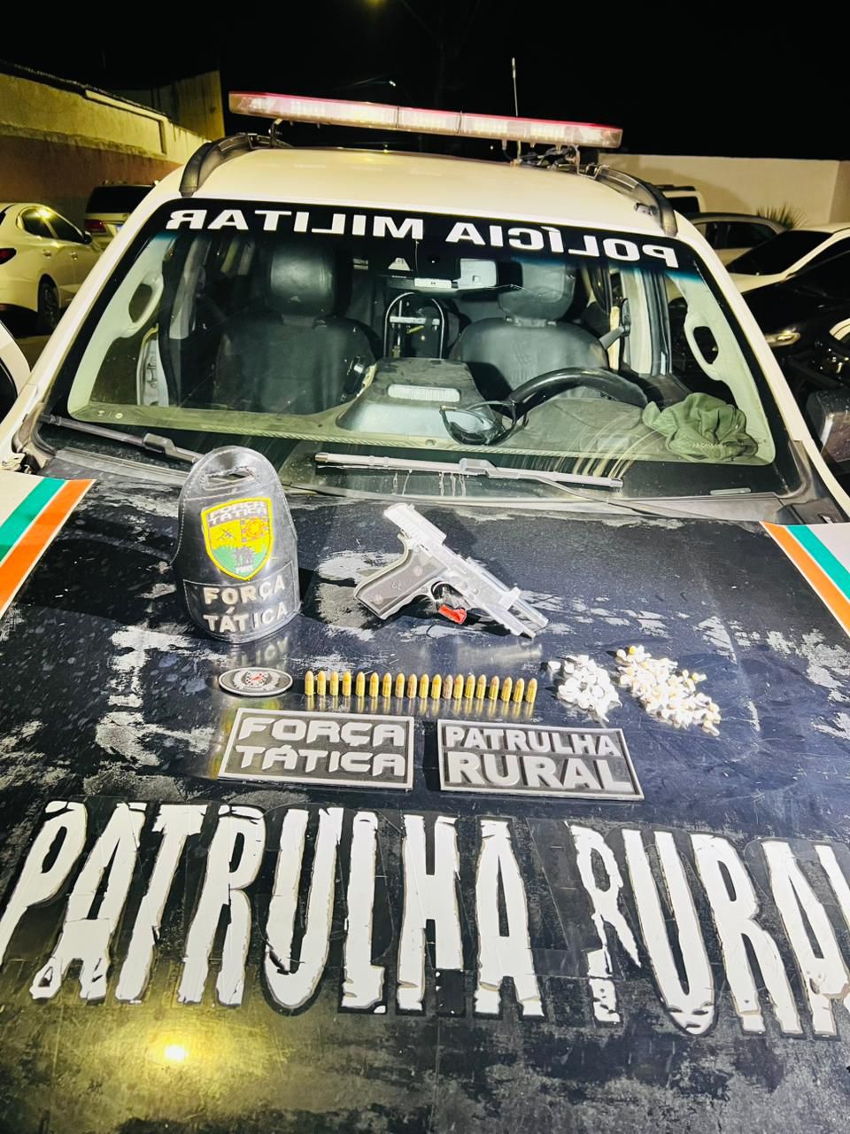 Equipes da Patrulha Rural e da Força Tática realizaram o cerco no local indicado na denúncia. Durante as diligências, o suspeito foi localizado e abordado, sendo flagrado na posse de arma de fogo, drogas e dinheiro em espécie.