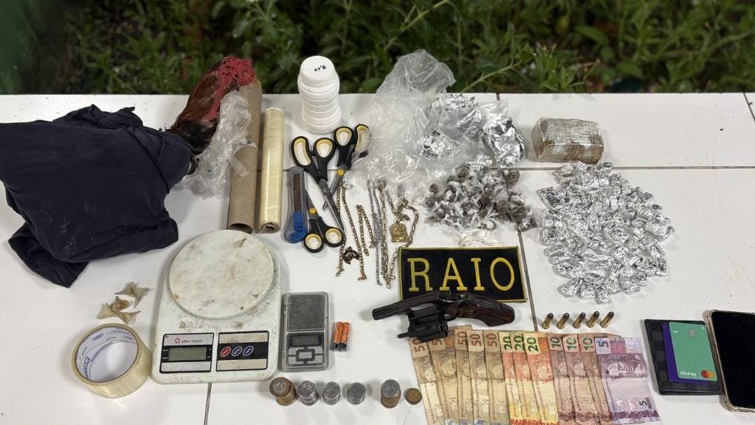 Nas buscas realizadas no imóvel e na área externa, os policiais localizaram aproximadamente 390 gramas de maconha, já fracionadas e prontas para comercialização, além de 2 gramas de cocaína, duas balanças de precisão, material para embalar drogas e R$ 330,00 em espécie. Também foi apreendido um revólver calibre .38, municiado com cinco munições. No quintal da residência, foi encontrado ainda um galo de briga com esporões, evidenciando indícios de maus-tratos a animais.