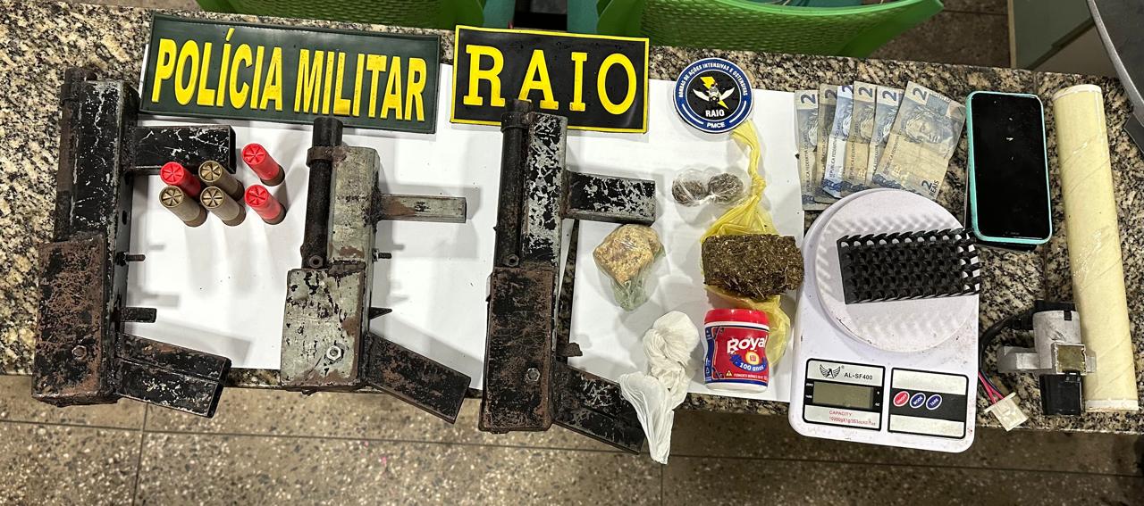 Durante a ação, foram apreendidas três espingardas artesanais calibre 12, seis munições intactas do mesmo calibre, além de entorpecentes, sendo 34 gramas de cocaína, 64 gramas de crack e 73 gramas de maconha. Também foram encontrados dois aparelhos celulares, uma ignição de motocicleta, uma tampa de carenagem de moto, uma balança de precisão e diversas embalagens utilizadas para o acondicionamento de drogas.