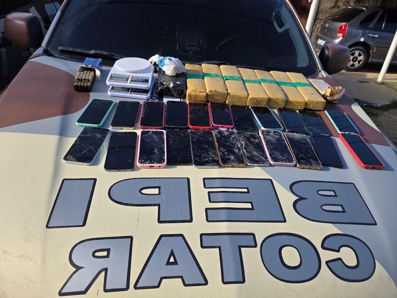 No imóvel ainda foram apreendidos 22 aparelhos celulares de diversas marcas e modelos sem comprovação de origem, duas balanças de precisão, duas bicicletas e a quantia de R$ 70 em dinheiro.