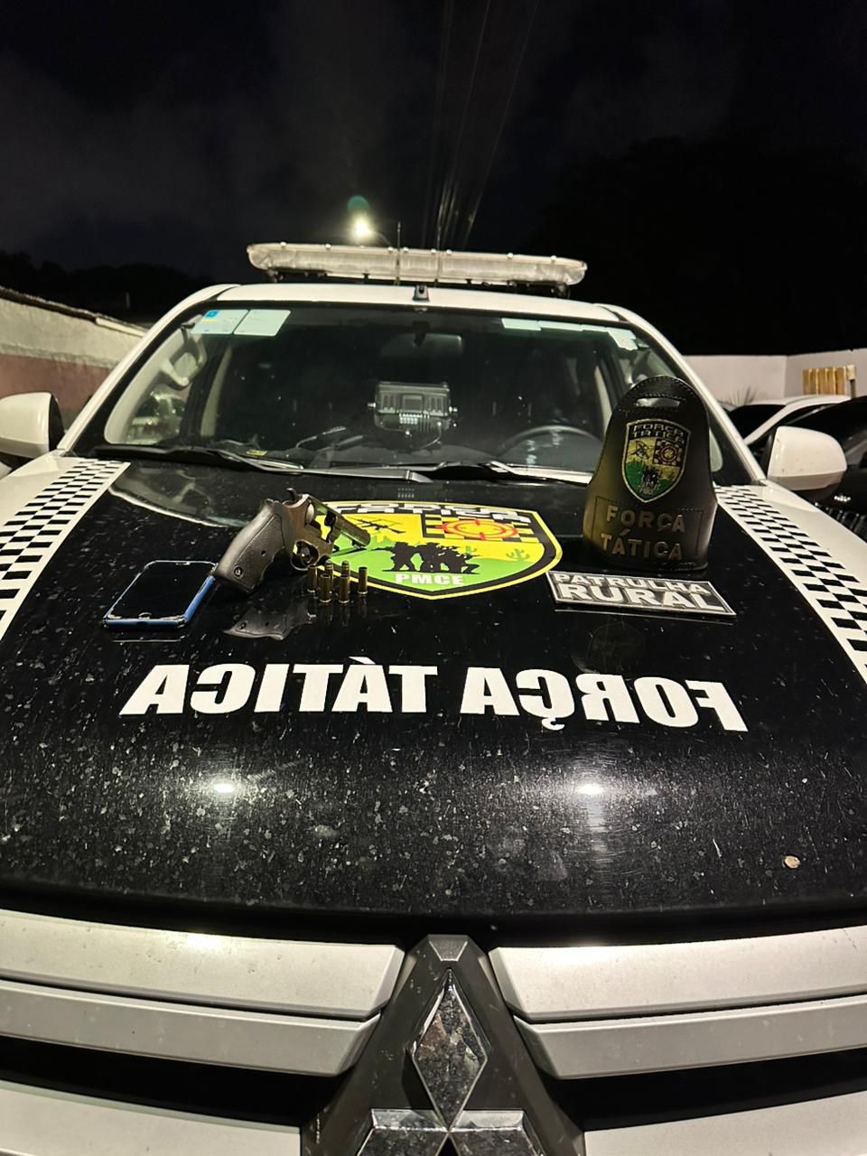 A Polícia Militar do Ceará (PMCE), por meio de equipes da 1ª Companhia do 12º Batalhão Policial Militar (1ª Cia/ 12º BPM), apreendeu um revólver calibre .38, munições e um aparelho celular após ação na madrugada deste sábado (7), no bairro Primavera, em Caucaia. Na ocorrência, um suspeito não identificado foi encontrado ferido após confronto com os policiais militares e foi socorrido mas não resistiu.