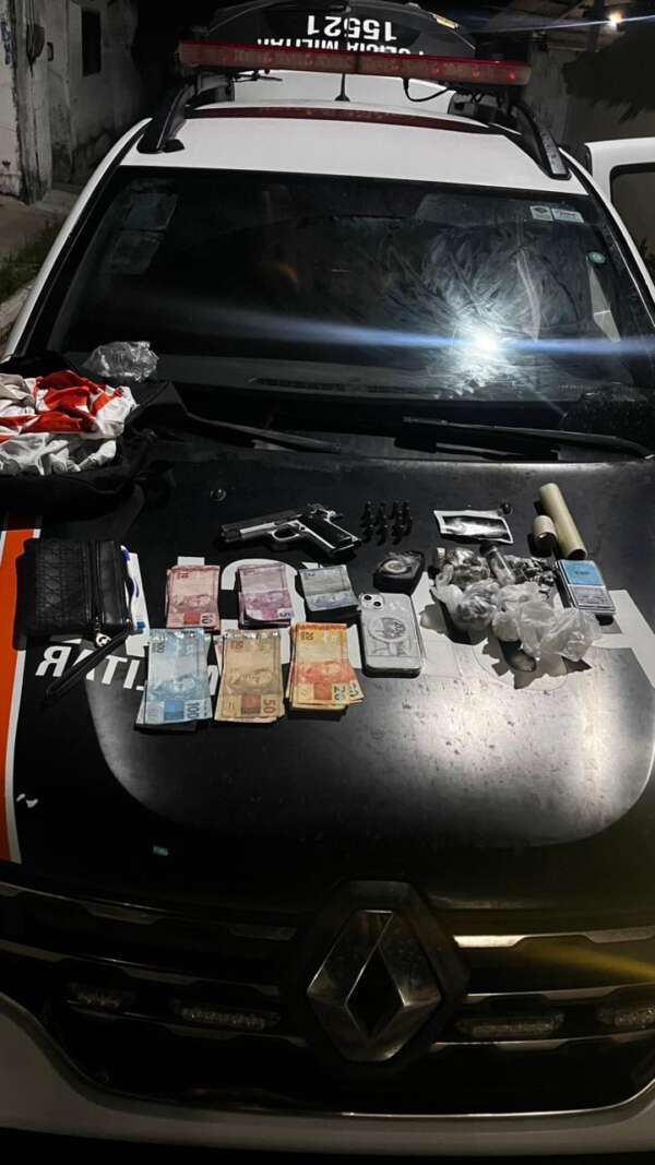 A Polícia Militar do Ceará (PMCE) prendeu um homem de 22 anos e apreendeu uma pistola calibre .380, um carregador com 23 munições, 113 gramas de maconha, 46 gramas de cocaína, uma balança de precisão, material para embalagem de drogas, um aparelho celular e R$ 3.698 em espécie durante uma ação na rua Adelina Ferreira Alves, no distrito de Camará, em Aquiraz, por volta de 1h37 desse sábado (7).