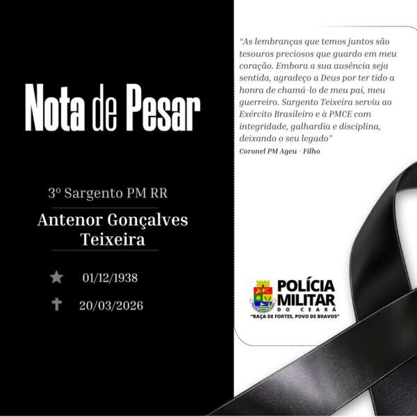 A Polícia Militar do Ceará (PMCE) informa com pesar o falecimento do 3ª sargento RR ANTENOR GONCALVES TEIXEIRA, 87, nesta sexta-feira (20).