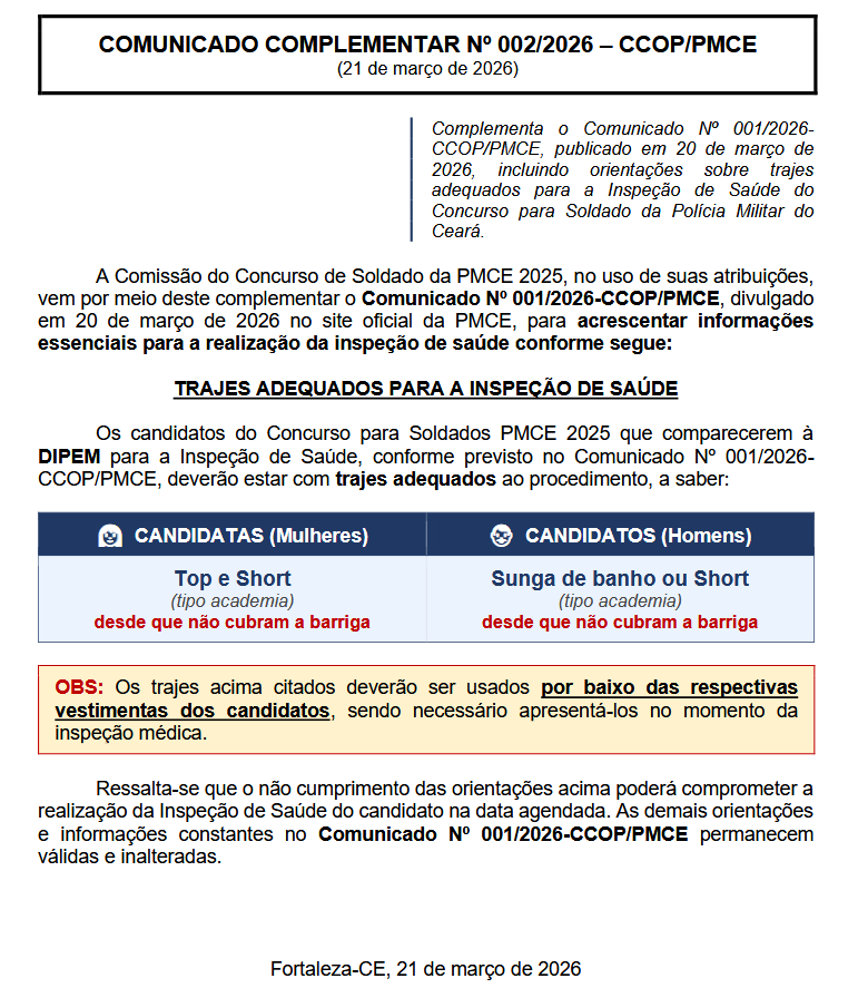Notícias COMUNICADO COMPLEMENTAR Nº 002/2026 – CCOP/PMCE 21 de março de 2026 - 18:44 Voltar ao topo Compartilhar
