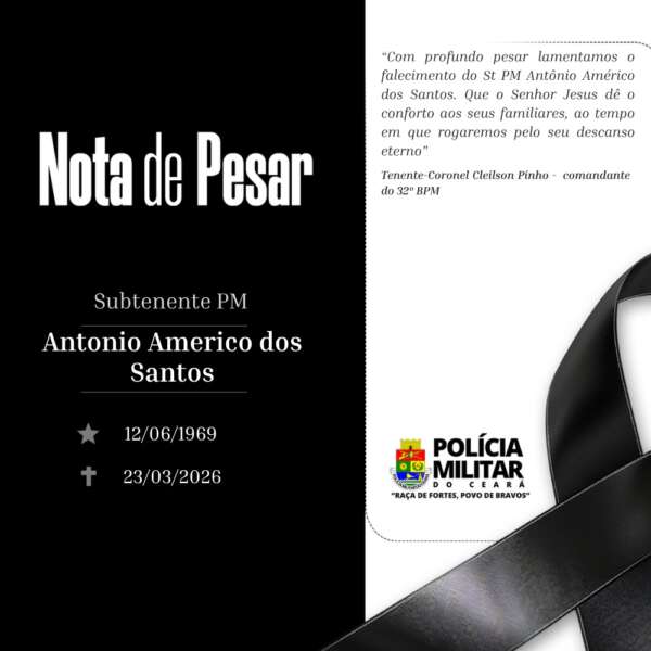 A Polícia Militar do Ceará (PMCE) informa com pesar o falecimento do Subtenente PM ANTONIO AMERICO DOS SANTOS, 56, nesta segunda-feira (23).