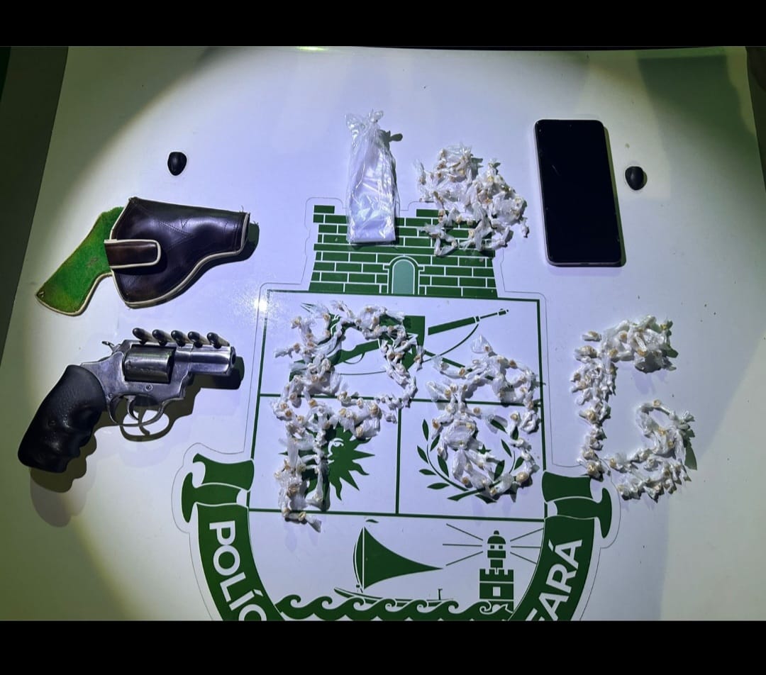 A Polícia Militar do Ceará (PMCE), por meio da 3ª Companhia do 19º Batalhão de Polícia Militar (3ª Cia/ 19º BPM), realizou, na madrugada desta terça-feira (24), a apreensão de uma arma de fogo, entorpecentes e a condução de um adolescente de 14 anos e um homem de 19 anos no bairro Passaré, em Fortaleza. A ação ocorreu durante patrulhamento na comunidade do Gereba, após os policiais visualizarem indivíduos em atividade suspeita relacionada ao tráfico de drogas.