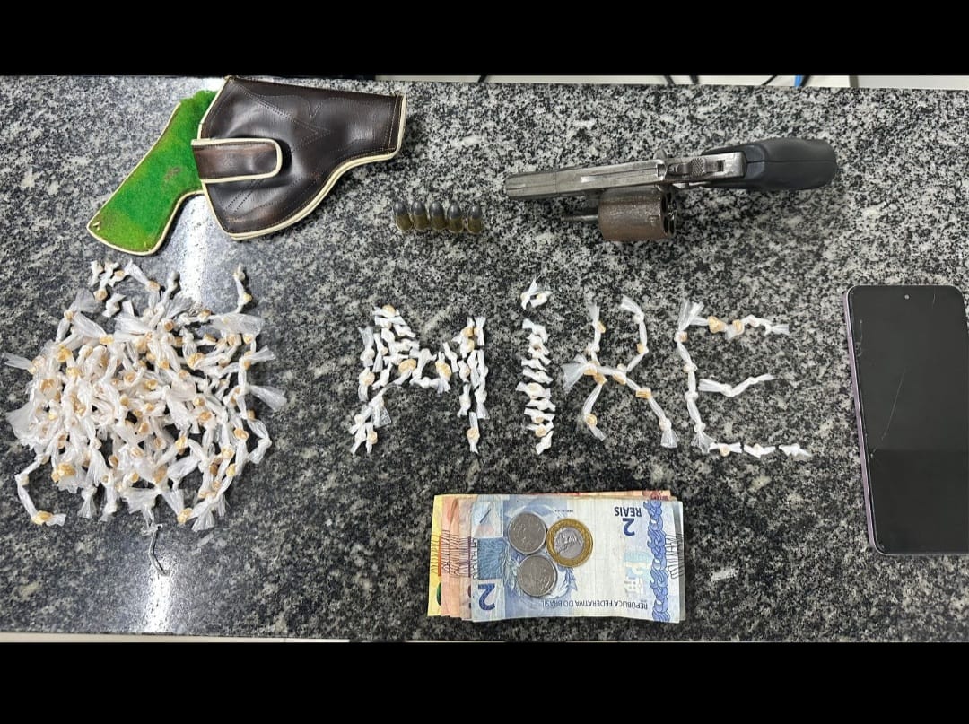 No local, foi apreendido um revólver calibre .38, modelo Taurus, com numeração raspada e municiado com cinco munições intactas, além de 262 pedras de crack (33 gramas), a quantia de R$ 56 em espécie e um aparelho celular.