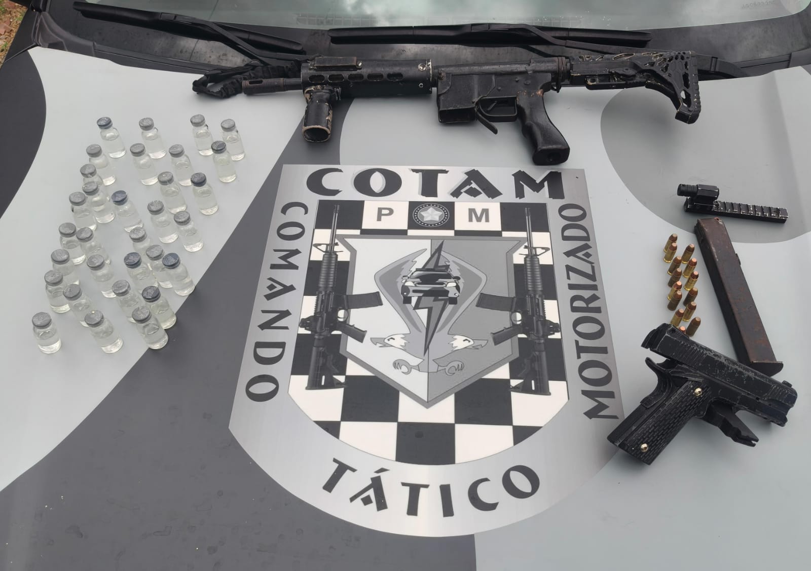 Ao perceberem a aproximação policial, indivíduos fugiram do local, sendo visualizado o momento em que um dos suspeitos arremessou uma sacola para o interior de uma residência. Durante as buscas, os policiais localizaram frascos contendo substância conhecida como “loló”, além de um fuzil artesanal calibre .40, acompanhado de 14 munições do mesmo calibre e um carregador.