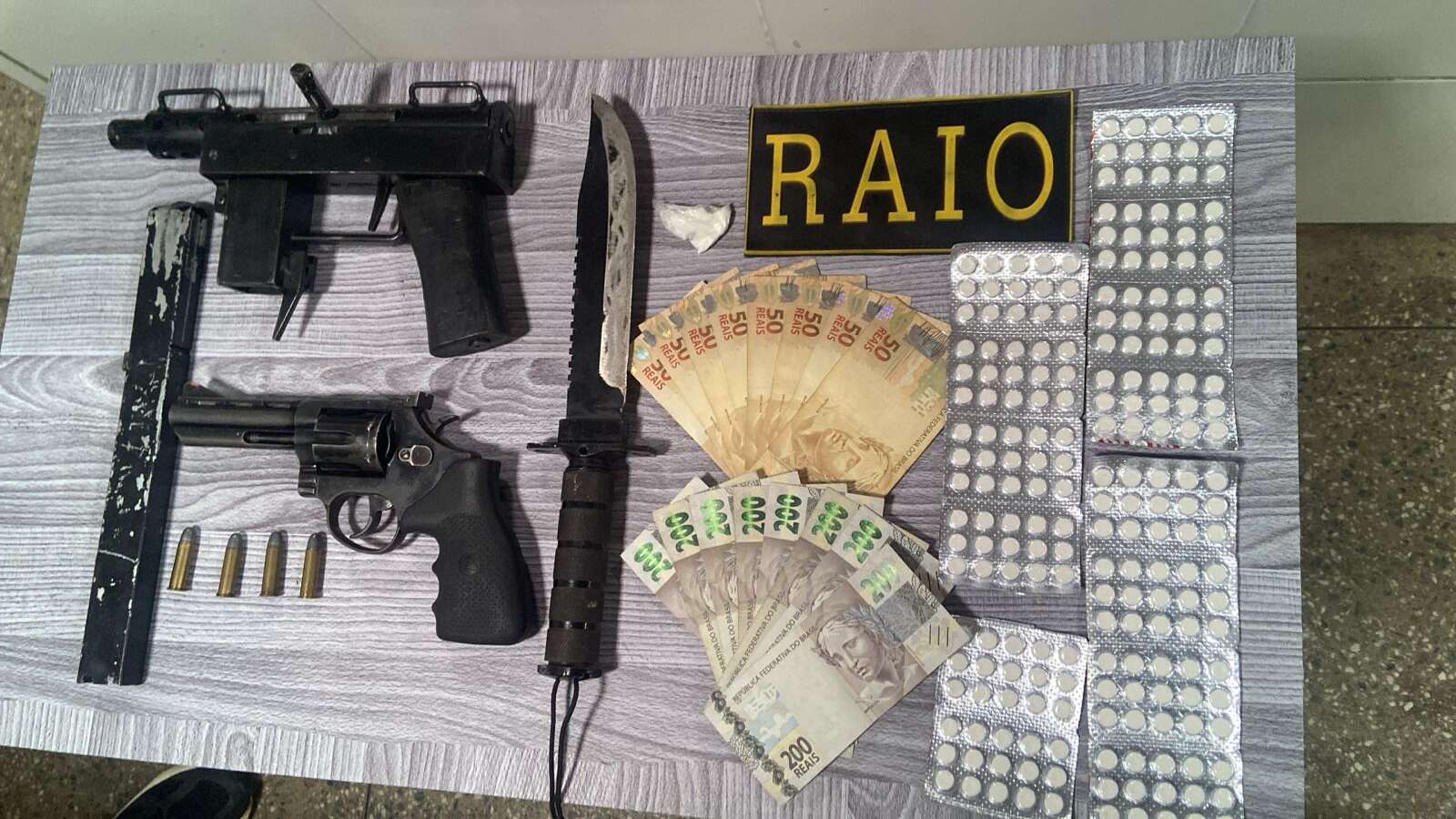 Na ação, foram apreendidos um revólver calibre .38 com quatro munições, uma arma de fogo artesanal calibre .380, um aparelho celular, a quantia de R$ 2.000 em dinheiro, 210 comprimidos de substância conhecida como “rebite”, uma faca e 2,1 gramas de cocaína.