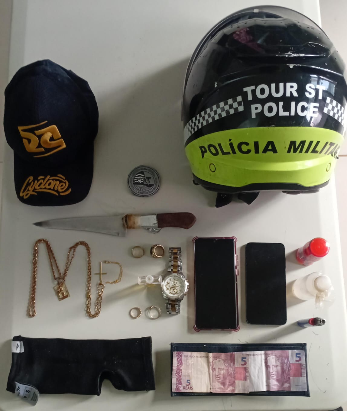 Durante a ação, foi apreendida uma faca utilizada no crime, além de diversos objetos, entre eles aparelhos celulares, bijuterias e dinheiro em espécie. Um dos celulares foi reconhecido por uma das vítimas como sendo de sua propriedade. Os demais itens apreendidos tiveram a origem apurada durante os procedimentos policiais.