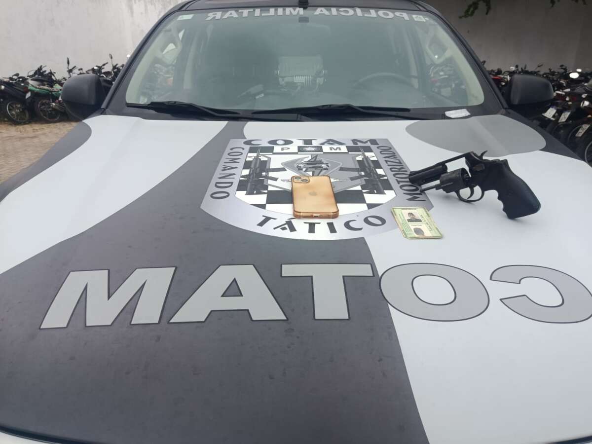 A Polícia Militar do Ceará (PMCE), por meio do Comando Tático Motorizado (COTAM), prendeu um homem de 25 anos, na tarde desse domingo (5), no Conjunto Habitacional Miguel Arraes, no bairro Siqueira, em Fortaleza. Com o suspeito, os policiais apreenderam um revólver.