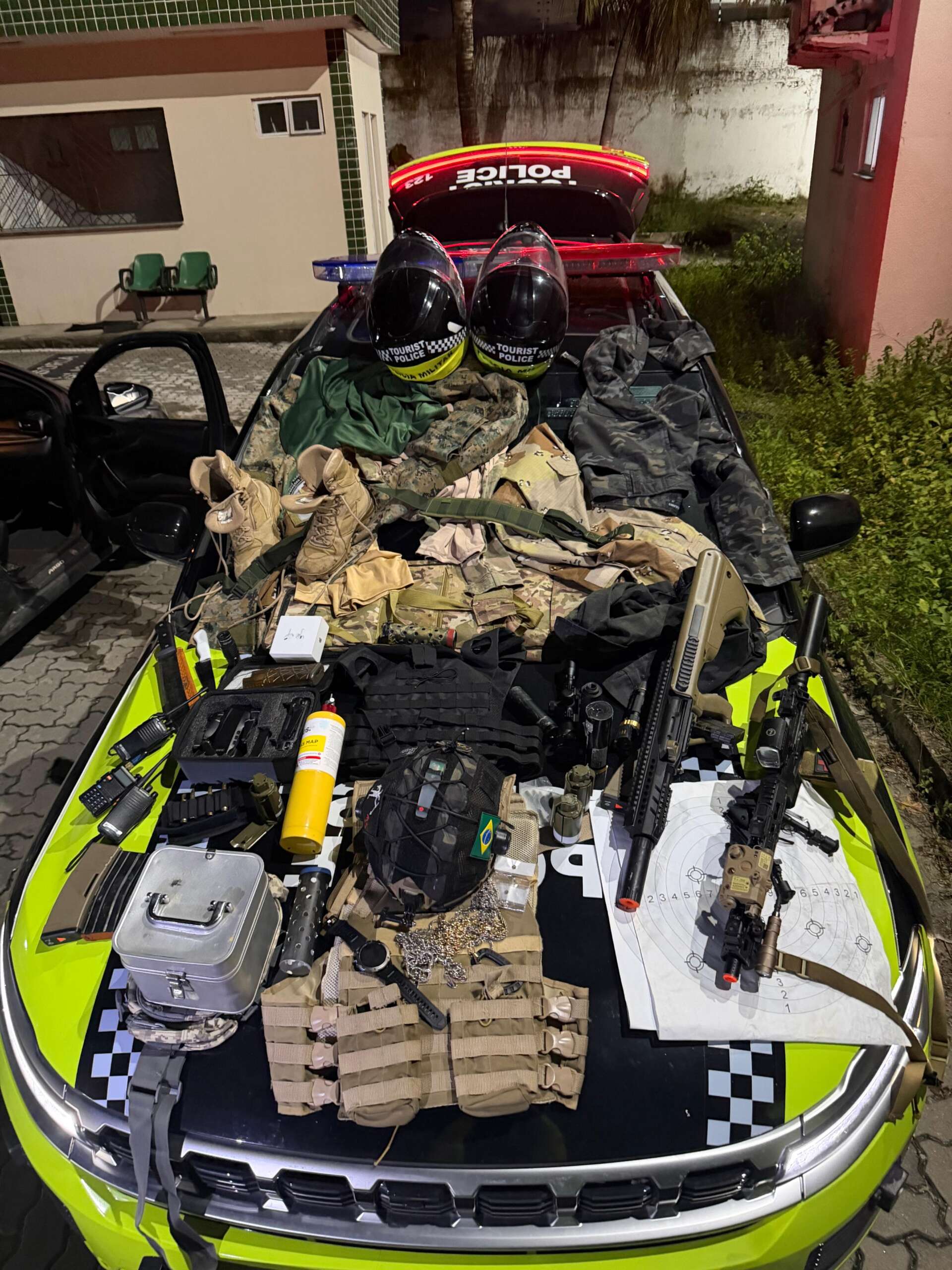 Foram apreendidos itens como facas, munição, rádios comunicadores, equipamentos de airsoft, vestimentas camufladas, além de joias e outros objetos. O veículo utilizado na ação também foi recuperado.