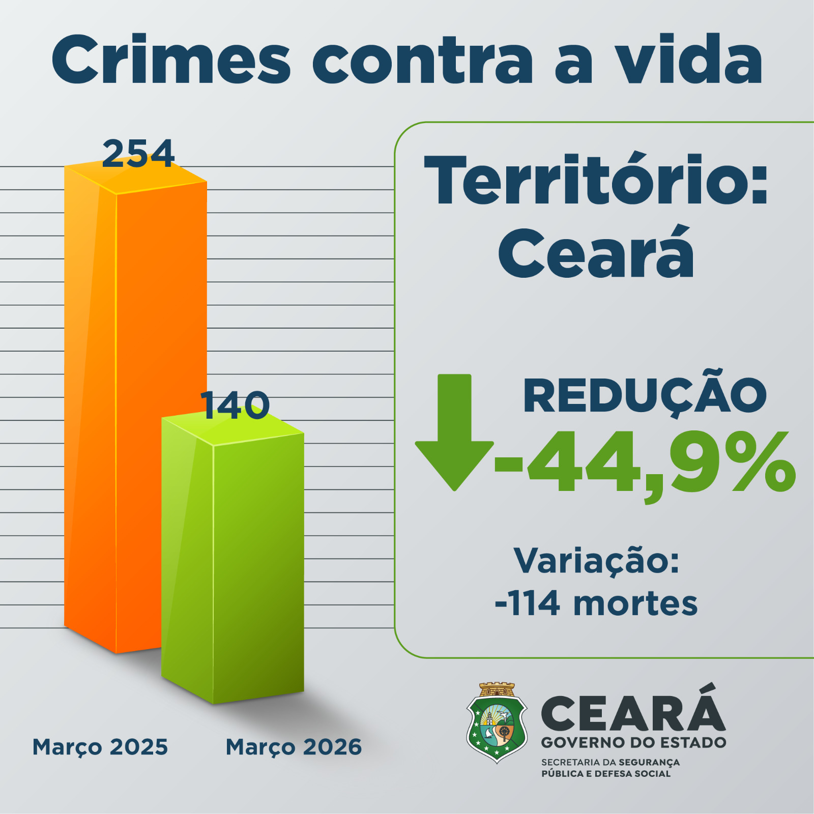 Conforme o levantamento da Supesp, o mês de março de 2026 encerrou com 114 mortes por crimes violentos a menos, que o mesmo período do ano passado. Foram 140 casos contra 254. Ainda comparando os dados de CVLIs registrados neste mês, a maior redução nas regiões do estado foi em Fortaleza, seguida pela Região Metropolitana e Interior Norte.