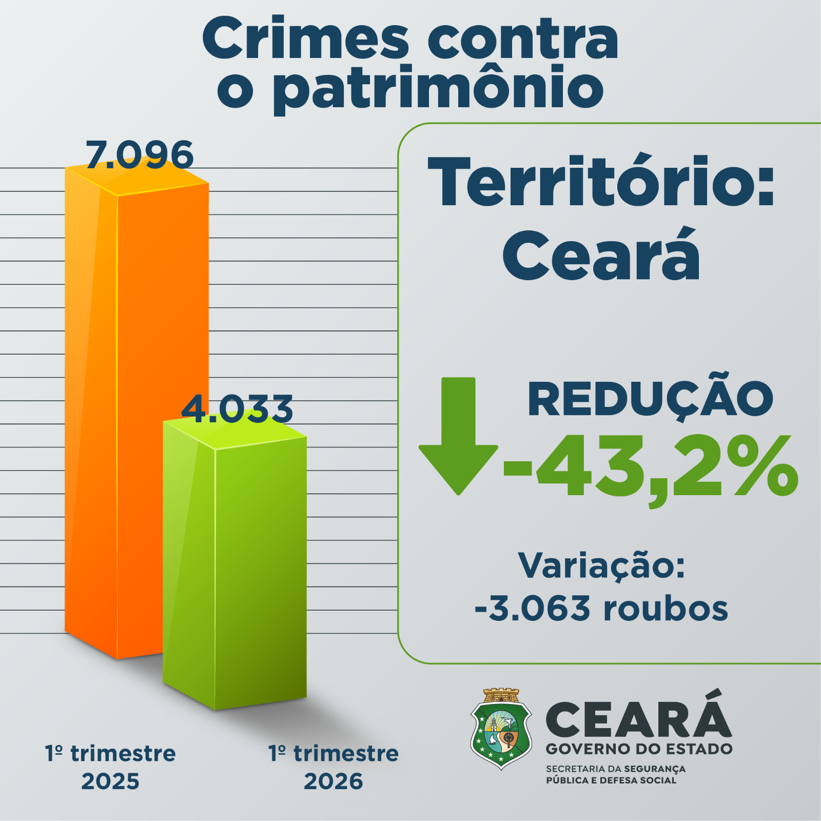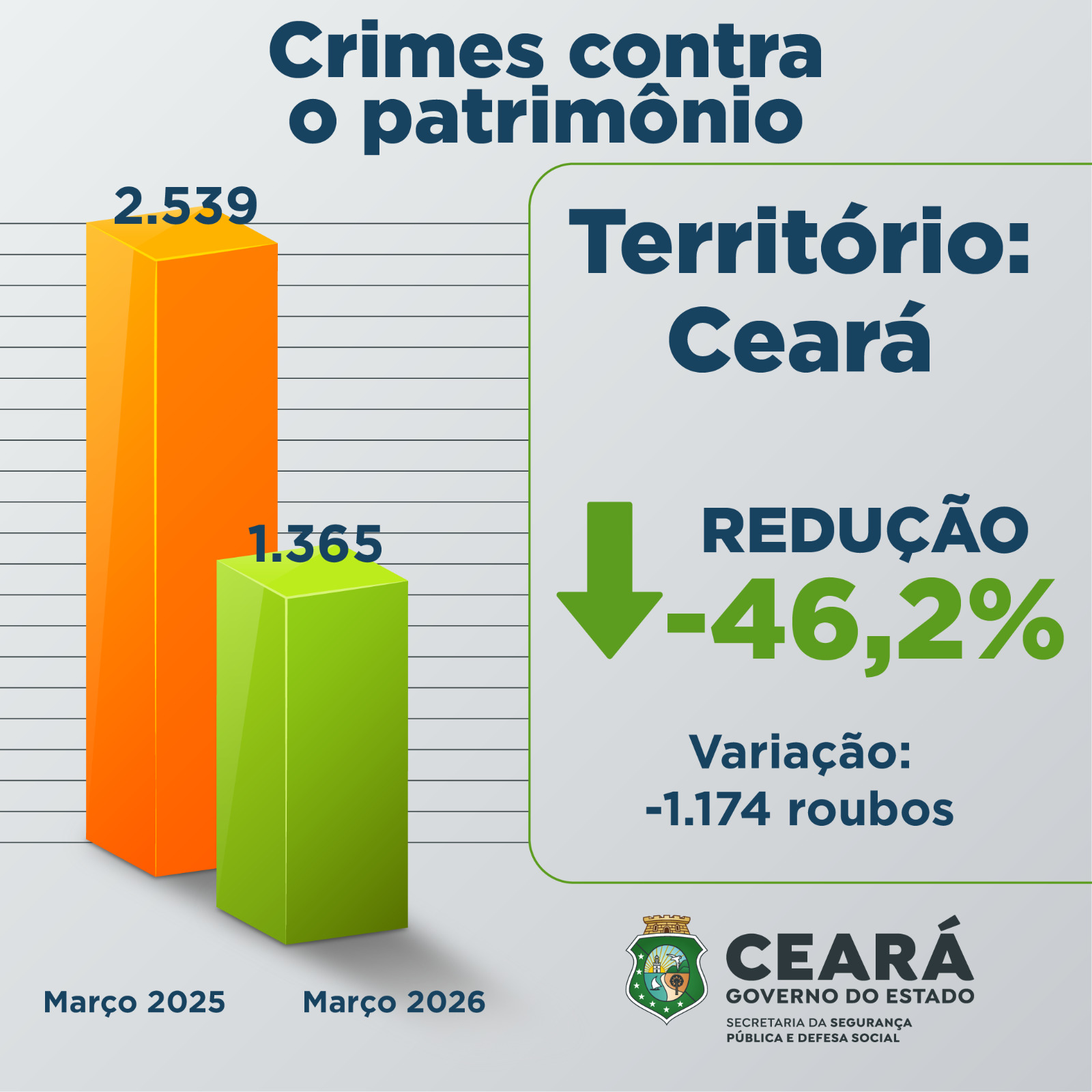 Como resultado do trabalho de repressão à criminalidade realizado pelas Forças de Segurança vinculadas à Secretaria da Segurança Pública e Defesa Social do Ceará (SSPDS-CE), março de 2026 apresentou reduções nos indicadores de Crimes Violentos Letais e Intencionais (CVLI), Crimes Violentos contra o Patrimônio (CVP) e Furtos, se comparado com o mesmo mês de 2025. O mês de março encerrou com diminuição de 44,9% no número de mortes por crimes violentos em todo o estado. Esse é o melhor resultado de toda a série histórica no que concerne aos CVLIs. Já os roubos também apresentaram redução de 46,2% no Ceará. Já o furto, reduziu 16,6% no estado.