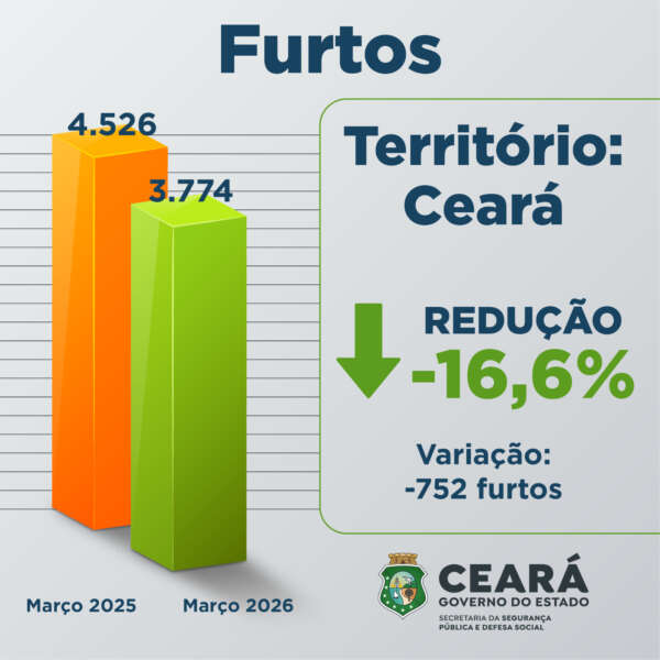 Durante o mês de março de 2026, o trabalho das Forças de Segurança do Ceará, aliado aos investimentos do Governo do Estado, proporcionou a redução de 16,6% nos furtos ocorridos em todo o estado. Foram 752 ocorrências a menos na comparação entre os períodos. Em março de 2026, foram 3.774 registros de furtos, enquanto no terceiro mês do ano passado, foram registrados 4.526 procedimentos.
