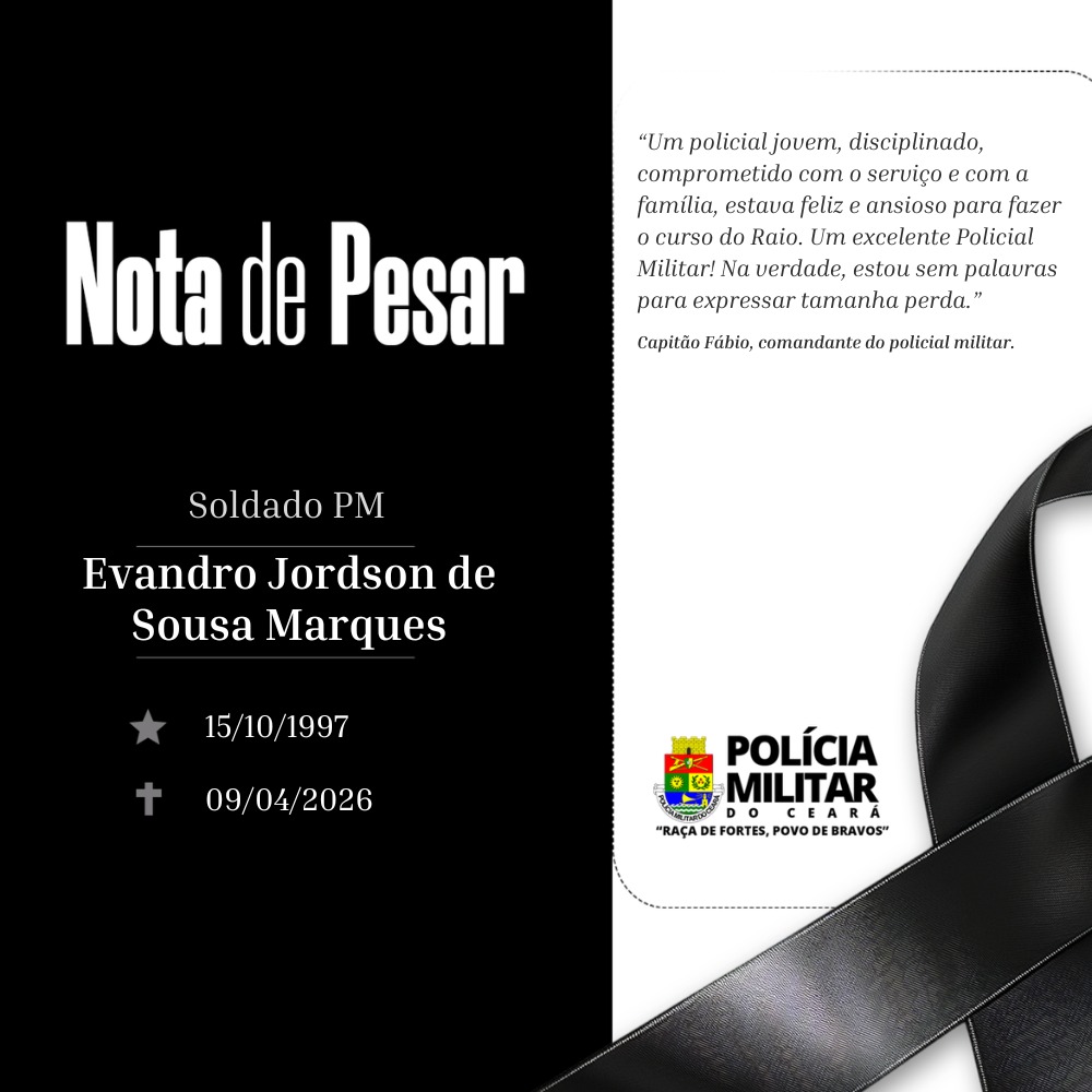 A Polícia Militar do Ceará (PMCE) informa com pesar o falecimento do soldado PM EVANDRO JORDSON DE SOUSA MARQUES, 28.