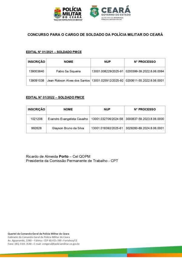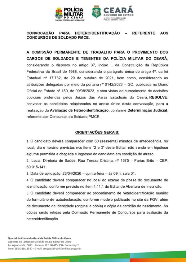CONVOCAÇÃO PARA HETEROIDENTIFICAÇÃO – REFERENTE AOS CONCURSOS DE SOLDADO PMCE