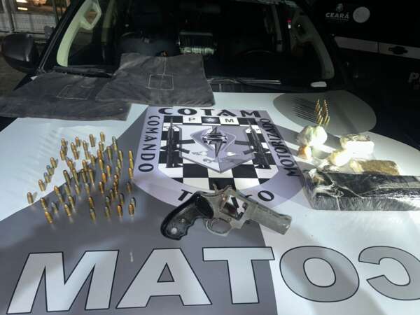 A Polícia Militar do Ceará (PMCE), por intermédio de equipes do Comando Tático Motorizado (Cotam), apreendeu um revólver calibre .38, 80 munições de calibres .380 e .38, 1,060 kg de maconha, 98 gramas de cocaína e 51 gramas de crack, além de duas placas balísticas, na noite desse sábado (11), na rua Via São José Ribamar, bairro Edson Queiroz, em Fortaleza.