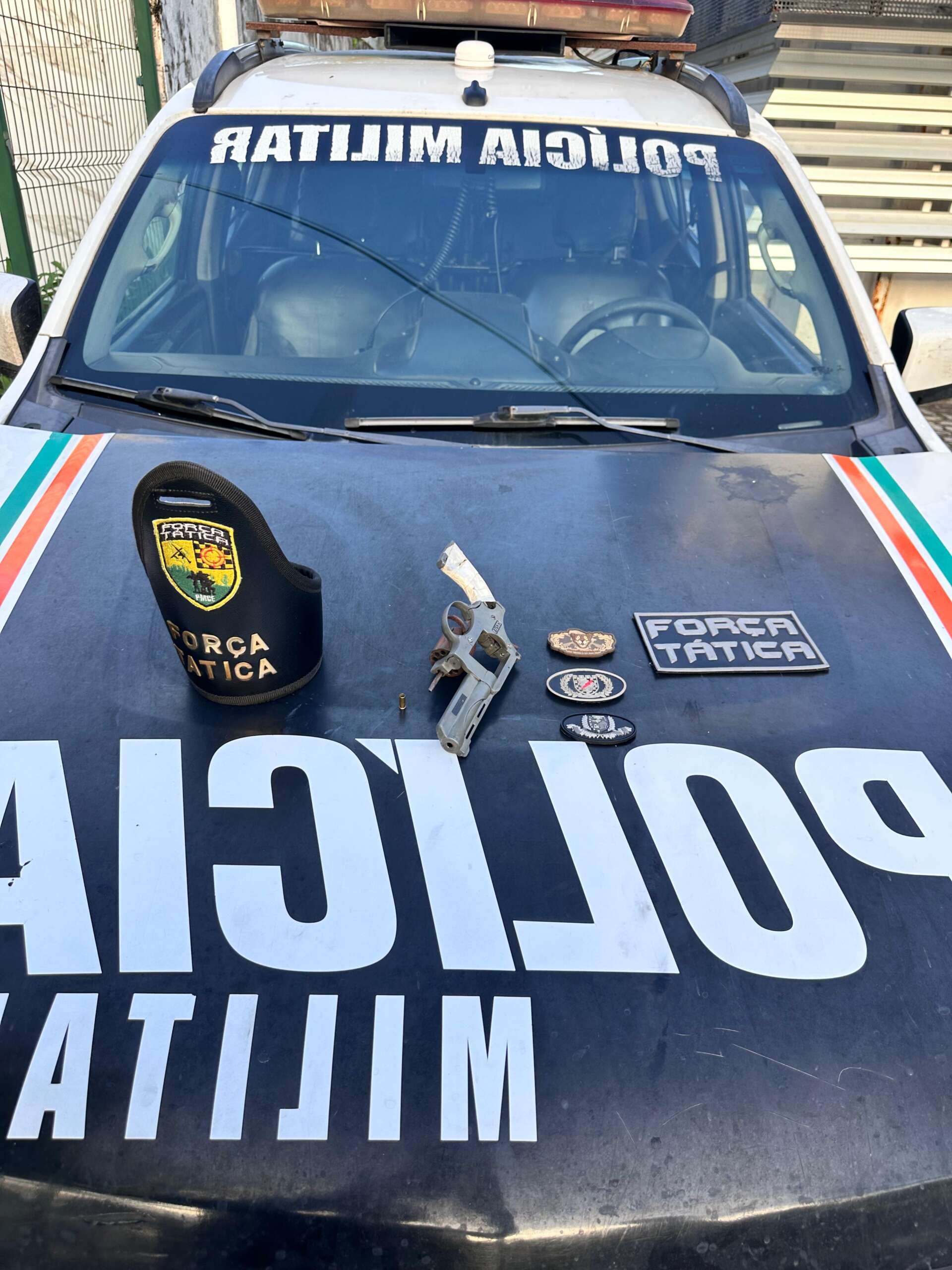Após garantir a segurança do perímetro, os militares realizaram buscas no local onde o indivíduo foi visto e localizaram um revólver calibre .22, da marca Custer, com capacidade para 10 munições e contendo uma munição deflagrada. O material foi apreendido.