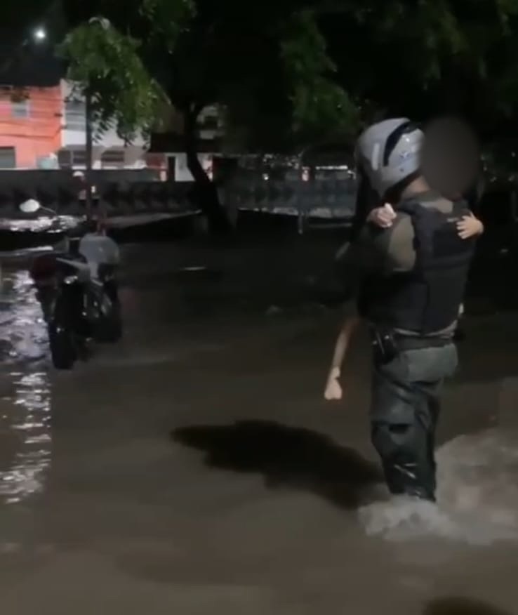 O militar retornava de um serviço extraordinário, por volta de 00h20, quando avistou uma mãe e seu filho tentando atravessar a avenida central sob forte correnteza. Diante do perigo iminente, o soldado interveio e amparou as vítimas, garantindo que chegassem ilesas à sua residência.