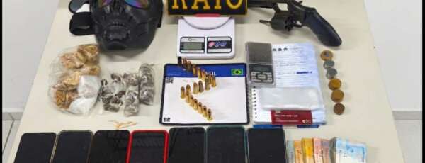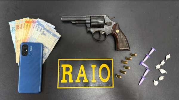 Durante patrulhamento ostensivo, os policiais visualizaram um veículo associado a denúncias de envolvimento com o tráfico de drogas e realizaram a abordagem. Na busca veicular, foram encontrados entorpecentes fracionados, além de dinheiro e um aparelho celular. Em continuidade à ocorrência, a equipe seguiu até a residência do suspeito, com autorização da companheira, onde localizou o revólver calibre .38 municiado.