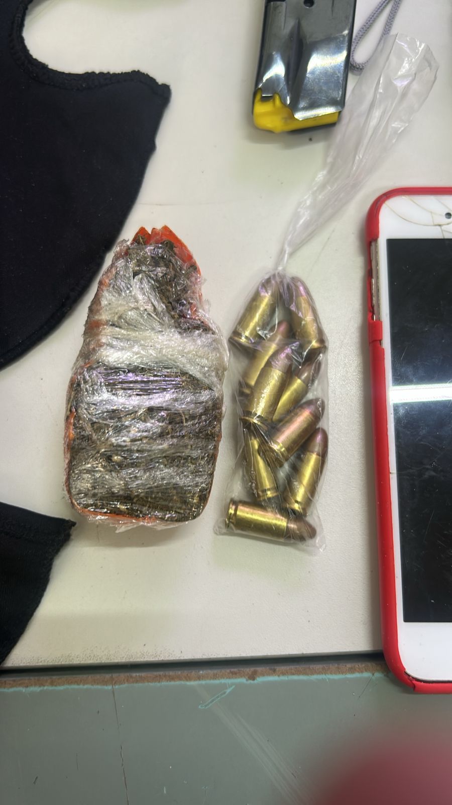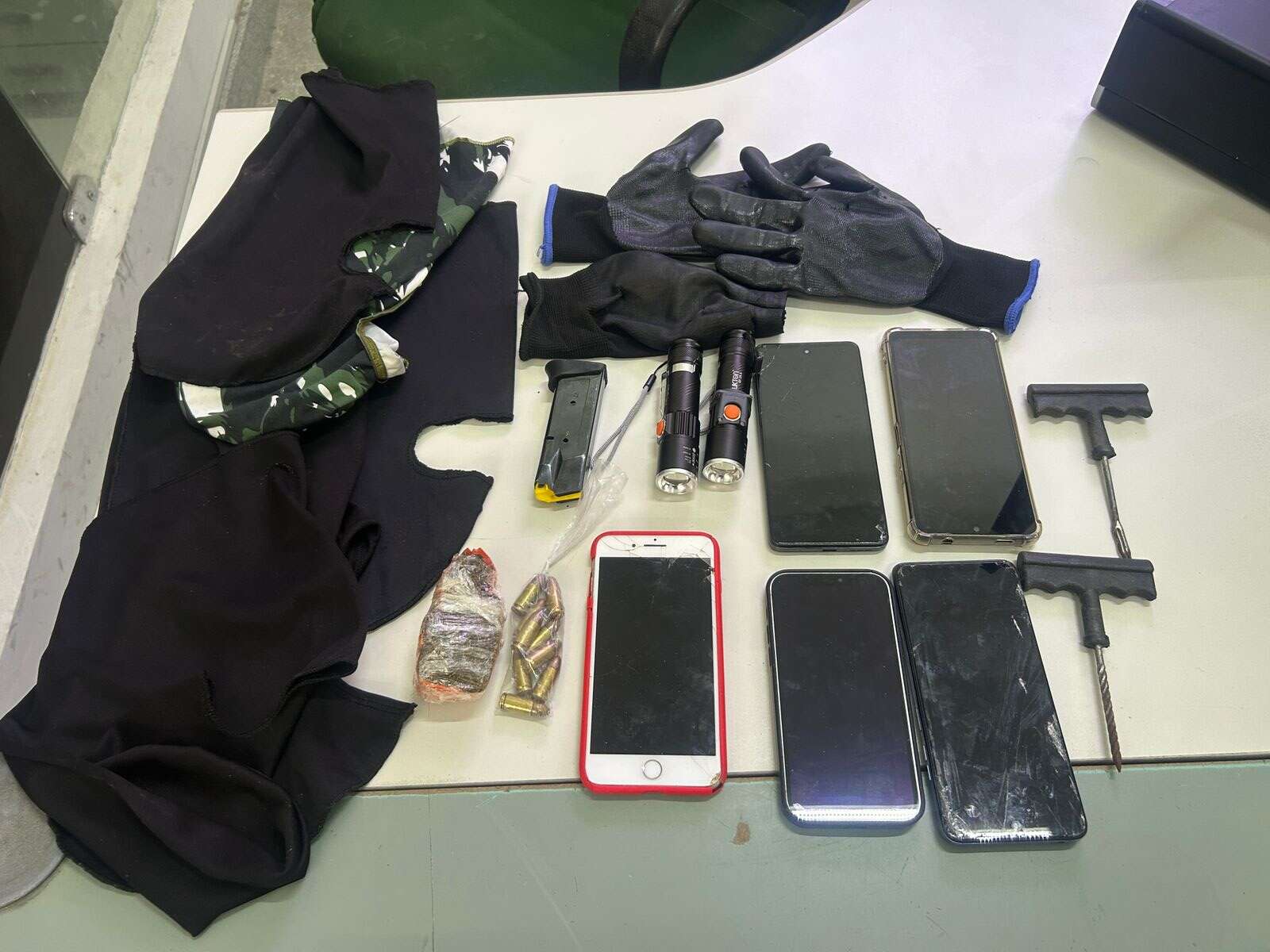 Durante a ação, seis indivíduos desembarcaram do veículo e foram contidos pela equipe policial. Na busca, foram encontrados um carregador de pistola calibre 9mm, nove munições, 63 gramas de maconha, quatro smartphones, além de ferramentas comumente utilizadas para violar ignição de motocicletas, como chaves “micha”. Também foram apreendidos trajes camuflados e balaclavas, indicando possível envolvimento em ações criminosas planejadas. Após consulta aos sistemas policiais, foi constatado que um dos suspeitos, de 21 anos, possuía mandado de prisão em aberto pelo crime de homicídio.