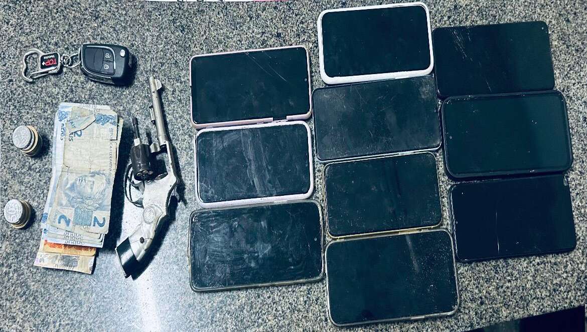Na ação, foram apreendidos um revólver calibre .22, com três munições picotadas e numeração suprimida, além de 10 aparelhos celulares, uma bicicleta, R$ 250 em espécie e um veículo utilizado na fuga.