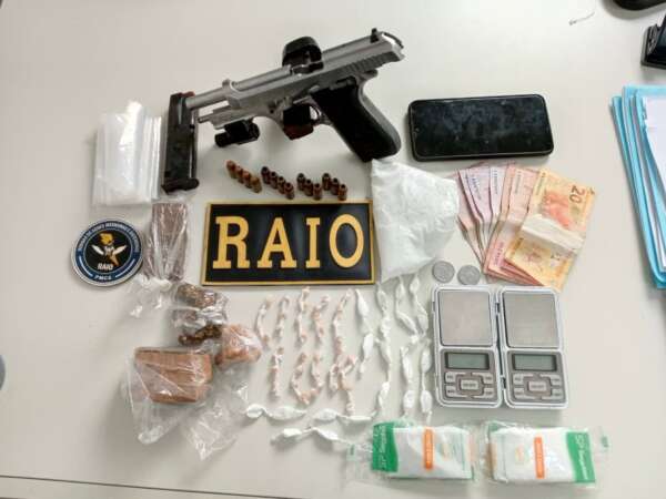 Durante a vistoria no imóvel, os policiais localizaram a arma de fogo, 1,57 kg de cocaína, 33 g de crack, 166 g de maconha e 20 trouxas adicionais da droga, balanças de precisão, material para embalo e dinheiro em espécie. Os suspeitos admitiram a prática ilícita no local.